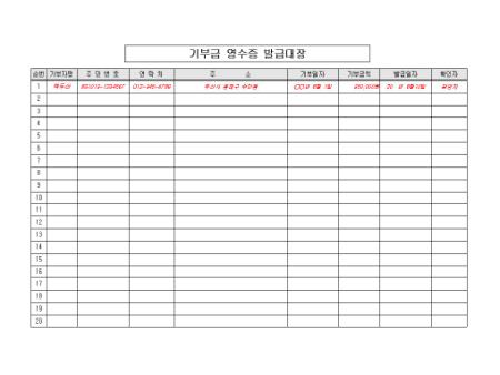 기부금에 대한 영수증을 발급할 때 사용하는 발급대장 서식입니다. 기부자명, 주민번호, 연락처, 주소, 기부일자, 기부금액 등을 자세히 작성하여 보관할 수 있습니다. 간단한 샘플이 포함되어 있습니다.