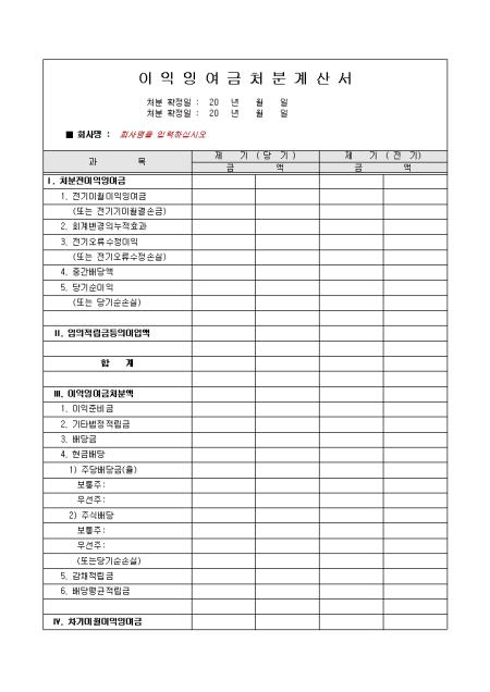 재무제표에 사용되는 이익잉여금 처분계산서 서식입니다. 처분전 이익잉여금, 임의적립금등의 이입액, 이익잉여금 처분액, 차기이월 이익잉여금등의 계정과목별로 작성할 수 있습니다.