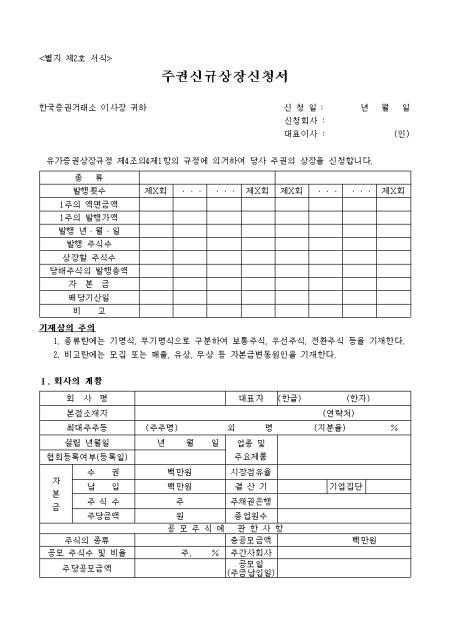 아래의 사항을 기록하는 주권신규상장신청서입니다. 1.회사의 개황 2.상장후 사용하고자 하는 명칭 등 3.주식의 분산 4.공모전,후 자기자본 내역 5.통일규격 주권