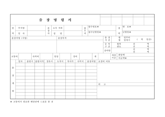 9,000원/월출장자 소속직위,성명,출장처명,출장목적,출장기간,출장계를 기록하는 출장명령서입니다.
