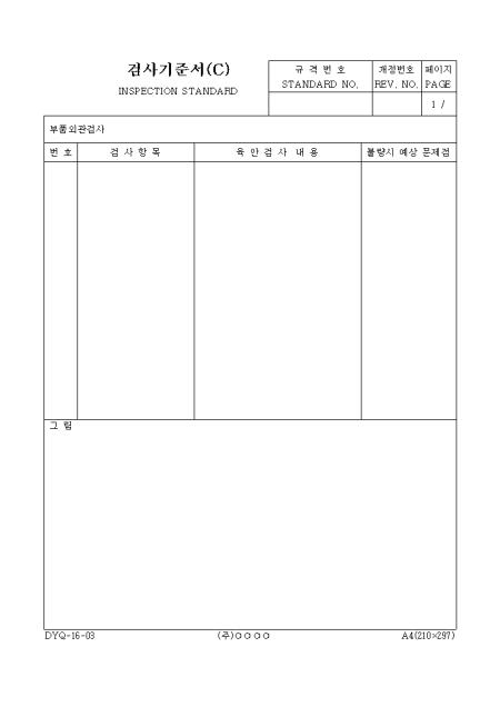 검사항목, 육안검사내용, 불량시 예상문제점등의 항목으로 구성된 검사기준서양식입니다.