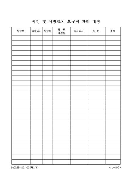 시정 및 예방조치 요구서를 발행한 내역을 관리하는 양식입니다. 발행부서, 발행자, 완료예정일, 실시부서등의 항목으로 구성되어 있습니다.