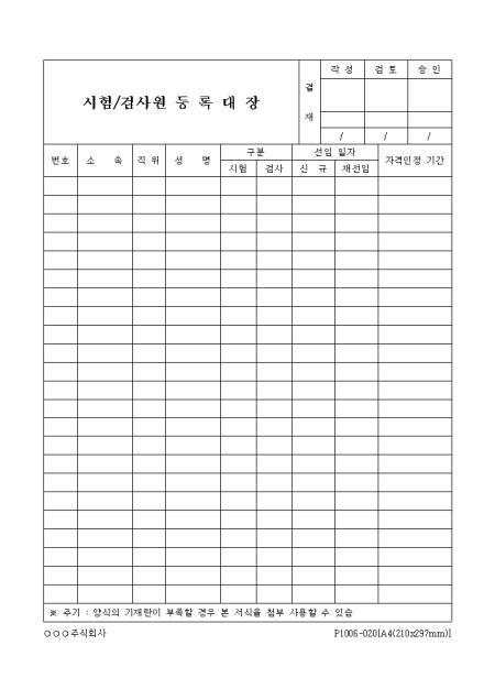 소속, 직위,성명, 구분, 선임일자, 자격인정기간등의 항목으로 구성되어 있는 시험또는 검사원의 등록대장 양식입니다.
