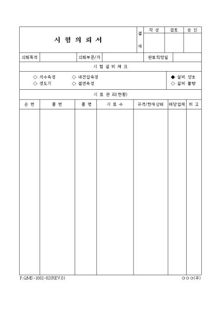 치수측정, 내전압측정, 경도기, 절연측정등을 통한 시험을 의뢰할 때 사용하는 양식입니다. 시료관리현황도 기입합니다.