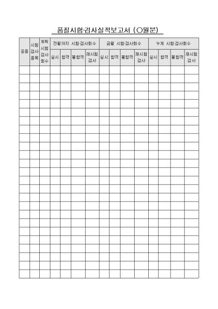 품질시험 검사의 실적을 보고할 때 사용하는 양식입니다. 시험검사 종목에 따른 각종 검사회수들을 기록합니다.