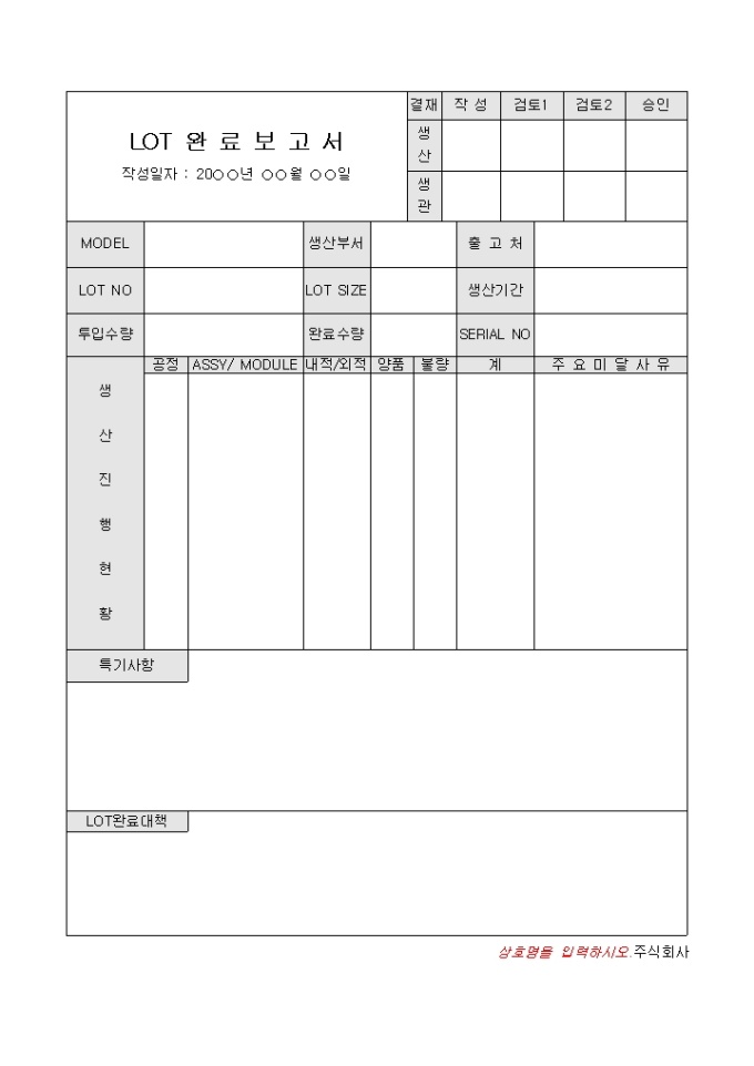9,000원/월LOT 생산진행현황, 특기사항, 완료대책등으로 구성된완료보고서 양식입니다.