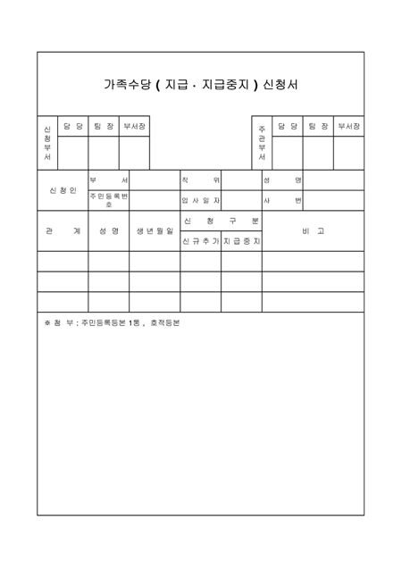 신청인 부서,직위,성명,주민번호,입사일,사번과 가족수당을 신청하는 가족의 성명,생년월일,신청구분을 기록하는 양식입니다.