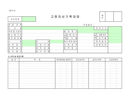 고정자산의 이력 및 회계기록,부속시설 및 부품,특기사항을 기록하는 양식입니다.
