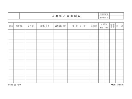 발행번호,고객명,품명,수량,불만내용,조치일자,시정조치를 기록하는 고객불만등록대장입니다.