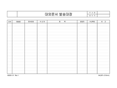 순서,발송일,문서번호,수신처,제목,담당자,수신확인,비고란으로 구성된 대외문서 발송대장입니다.