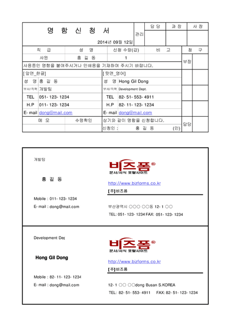 직급,성명,신청수량,명함의 앞면과 뒷면의 기재내용을 기록하는 명함신청서입니다.
