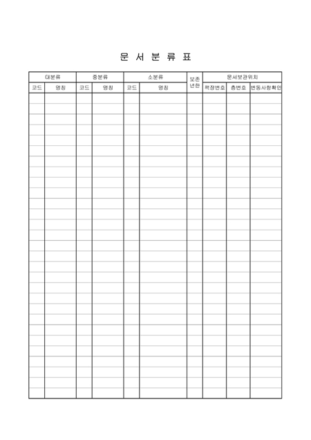대분류,중분류,소분류의 코드,명칭과 보존년한,문서보관위치를 기록하는 문서분류표입니다.