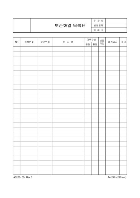기록번호,보관위치,문서명,기록구분,보존기간,폐기일자를 기록하는 보존화일 목록표입니다.