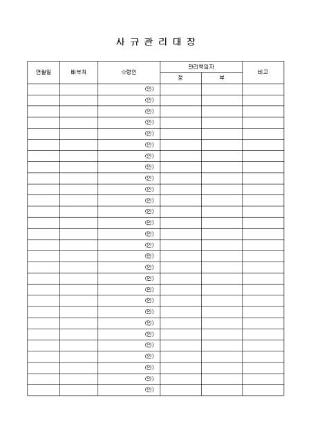 연월일,배부처,수령인,관리책임자를 기록하는 사규관리대장입니다.