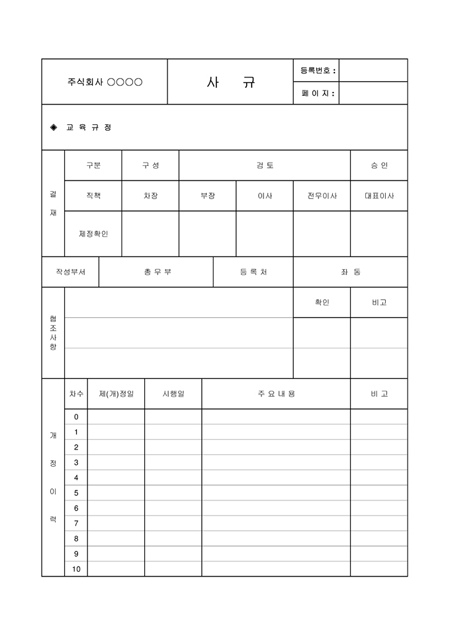 결재,협조사항,개정이력을 기록하는 사규표지대장입니다.