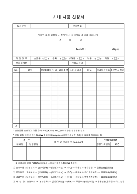 품목,전산CODE,단위,요청수량,소비자가격,용도,공급확정수량,주문부서확인을 기록하는 사내사용신청서입니다.