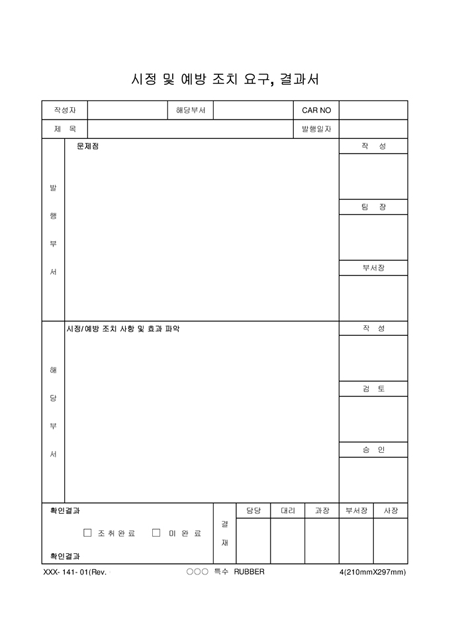 발행부서의 문제점,해당부서의 시정/예방 조치사항 및 효과파악을 기록하는 양식입니다.