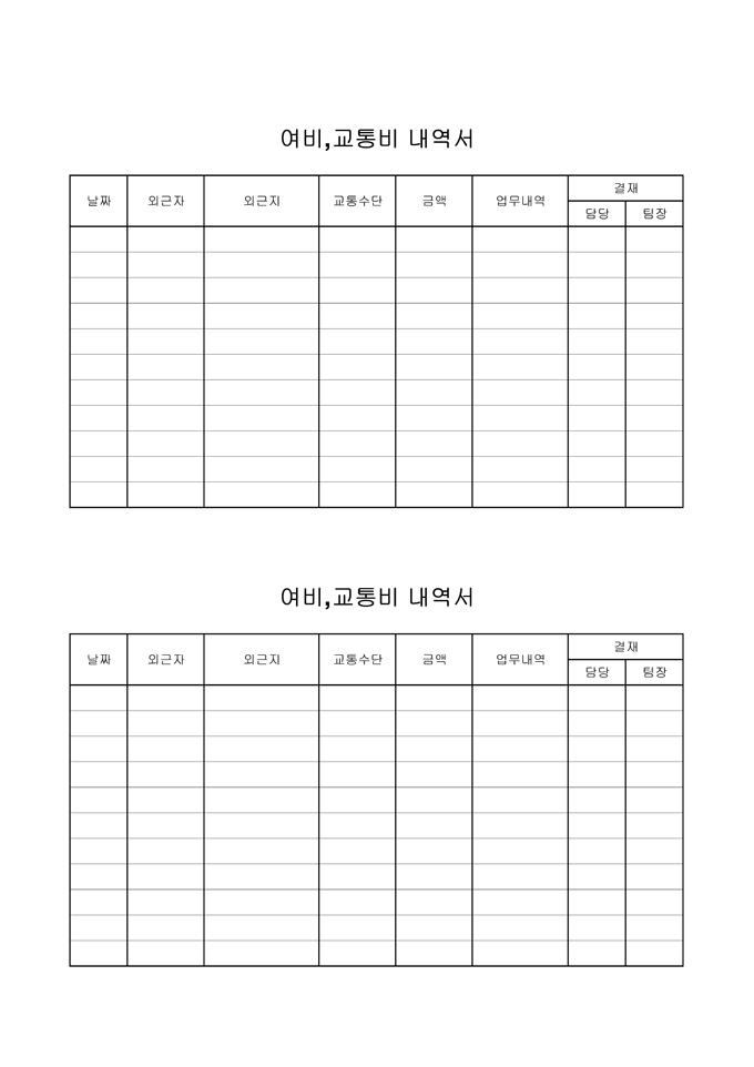 9,000원/월날짜,외근자,외근지,교통수단,금액,업무내역을 기록하는 여비,교통비 내역서입니다.