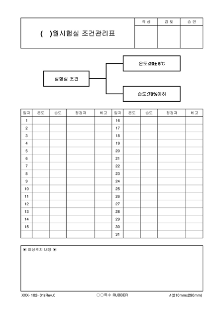 온도,습도,점검자를 기록하는 시험실 조건관리표입니다.