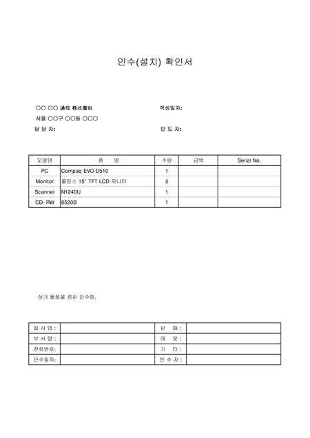 모델명,품명,수량,금액,시리얼번호를 기록하는 인수(설치)확인서입니다.