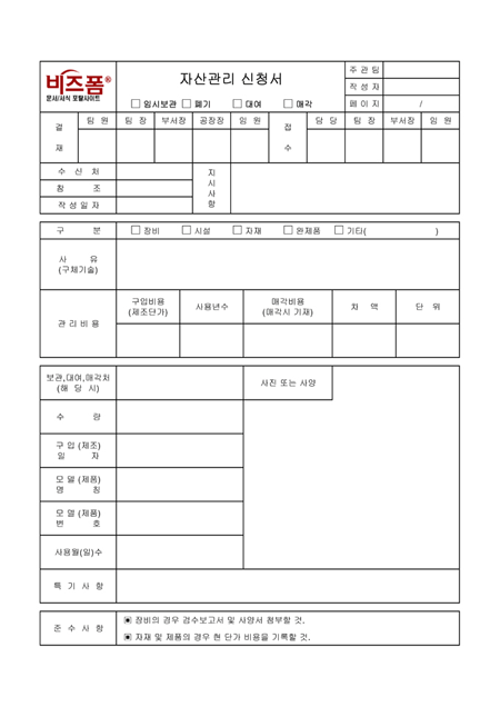 구분,사유,관리비용,보관/대여/매각처,수량,구입일자,모델명칭,모델번호,사용월수,특기사항을 기록하는 자산관리신청서입니다.
