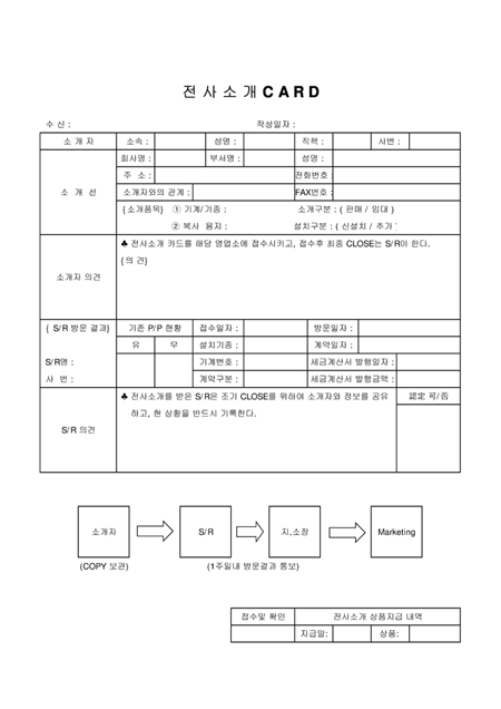 소개자 인적사항,소개자의견,방문결과등을 기록하는 전사소개카드입니다.