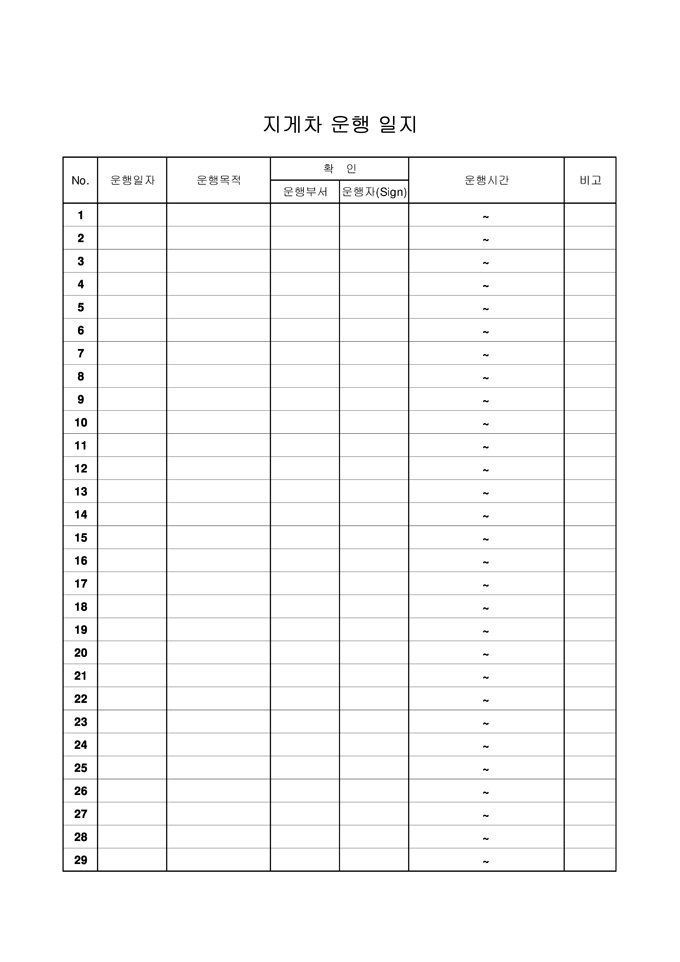 9,000원/월운행일자,운행목적,운행시간을 기록하는 지게차운행일지입니다.