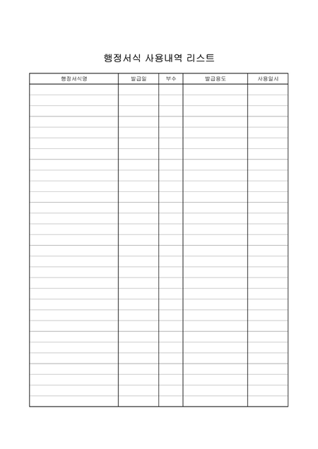 행정서식명,발급일,부수,발급용도,사용일시를 기록하는 행정서식 사용내역 리스트입니다.