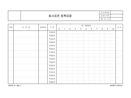 번호,표준명,표준번호,구분,제/개정번호를 기록하는 회사표준 등록대장입니다.