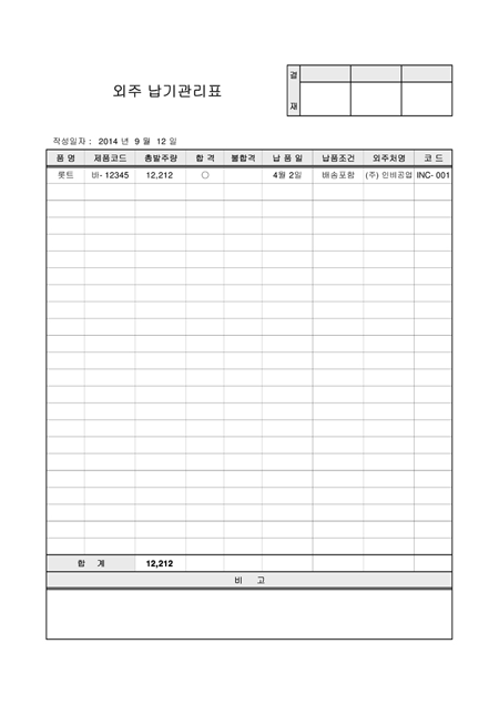 외주납기관리표로서 품명,제품코드, 총발주량, 합격, 불합격, 납품일, 납품조건, 외주처명,코드 항목으로 구성되어 있습니다.