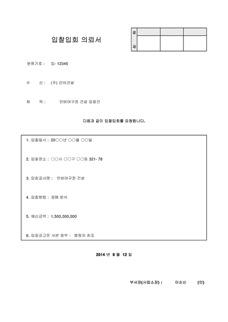 입칠입회의뢰서로서 수신자, 제목, 입찰의뢰 내용항목으로 구성되어 있습니다.