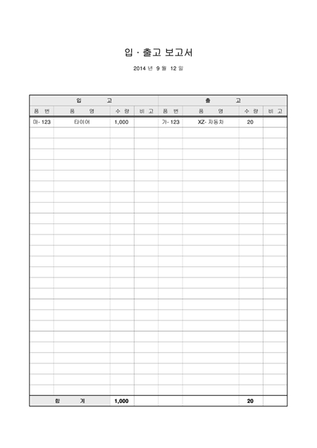 입,출고 내역을 작성할때 사용하는 서식으로서 입고내역, 출고내역 항목으로 구성되어 있습니다.