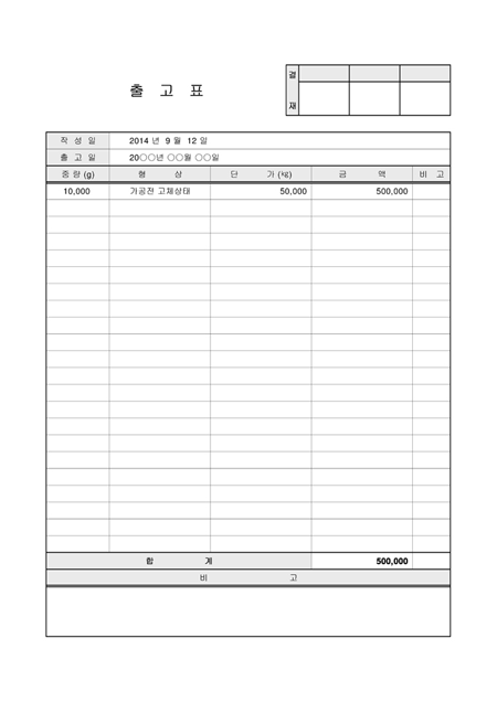 제품의 출고표입니다. 작성일, 출고일, 중량, 형상, 단가, 금액, 비고 항목으로 구성되어 있습니다.