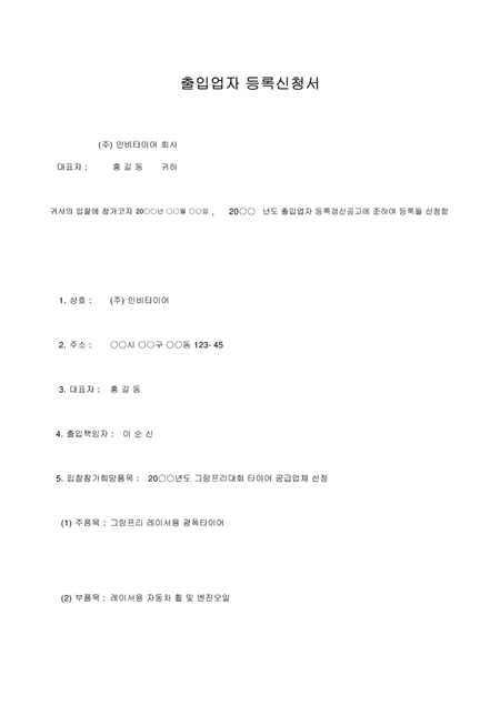 출입업자등록 신청서 입니다. 상호, 주소, 대표자, 출입책임자, 입찰품목 항목으로 구성되어 있습니다.
