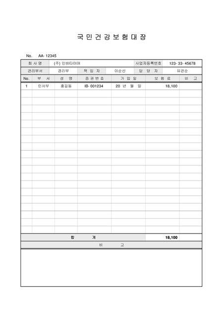 회사명, 사업자번호, 관리부서, 담당자, 책임자, 보험대상자 부서, 성명, 증권번호, 가입일, 보험료로 항목으로 구성된 국민건강보험 관리대장입니다.