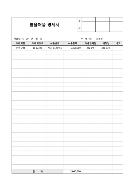 거래처명, 거래처코드, 어음번호, 어음금액, 어음만기일, 예정일 항목으로 구성된 받을어음 명세서입니다.