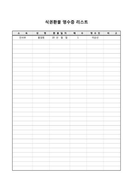 소속, 성명, 환불일자, 매수, 영수인, 비고 항목으로 구성된 식권환불 영수증 리스트입니다.