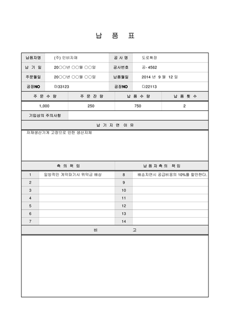 제품 납품 확인서로 납품자의 정보, 납품수량, 납품지연사유, 수령인과 납품자의 책임 항목으로 구성되어 있습니다.