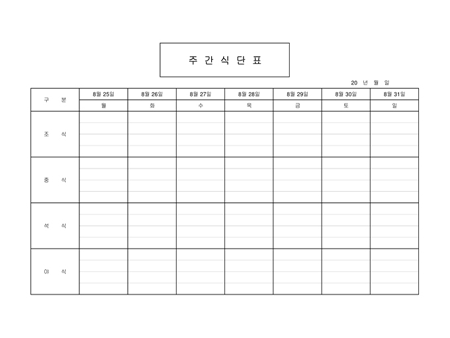 조식, 중식, 서식, 야식으로 나눠 요일별 주간식단표을 작성하는 양식입니다.