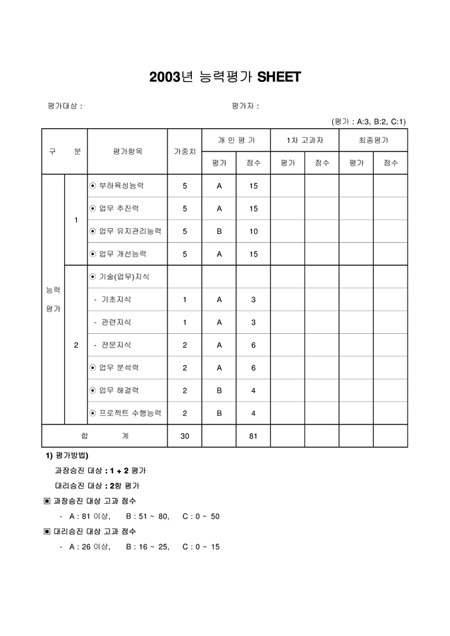 아래의 항목을 평가하는 능력평가시트입니다. 1.부하육성능력 2.업무추진력 3.업무유지관리능력 4.업무개선능력 5.기술지식 6.업무분석력 7.업무해결력 등..