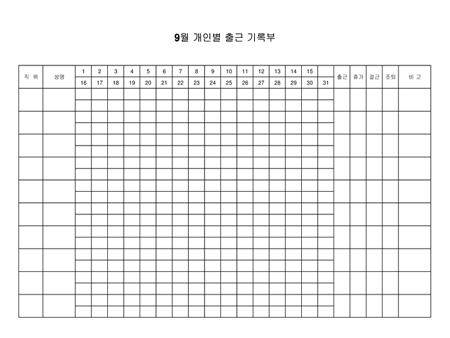 한달동안으 출근,휴가,결근,조퇴 상황을 기록할 수 있는 출근부 양식입니다.