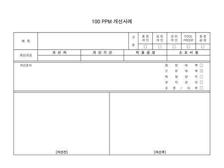 제목,개선개요,개선효과를 기록하는 100 PPM 개선사례양식입니다.