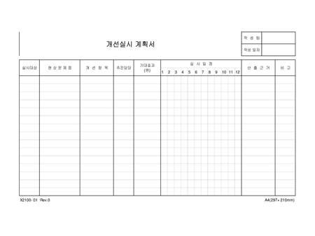 실시대상,현상문제점,개선항목,추진담당,기대효과,실시일정,산출근거를 기록하는 개선실시 계획서입니다.