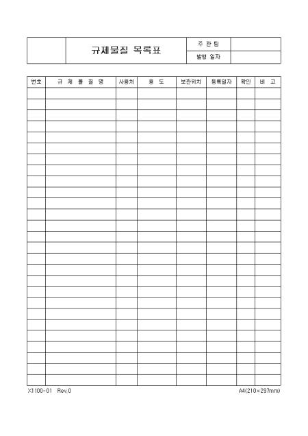 번호,규제물질명,사용처,용도,보관위치,등록일자를 기록하는 규제물질 목록표입니다.