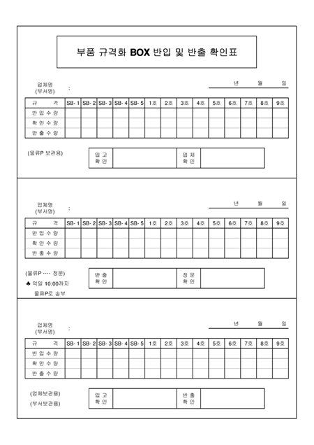 부품별 반입수량,확인수량,반출수량을 기록하는 양식입니다.