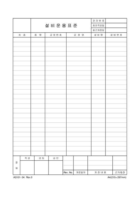 차종,품명,공정번호,공정명,설비명,설비번호를 기재하는 설비운용표준입니다.