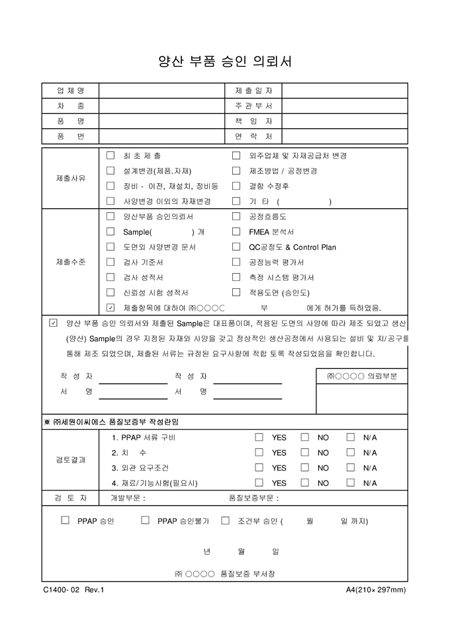 업체명,차종,품명,품번,제출사유,제출수준을 기록하는 양산 부품 승인 의뢰서입니다.