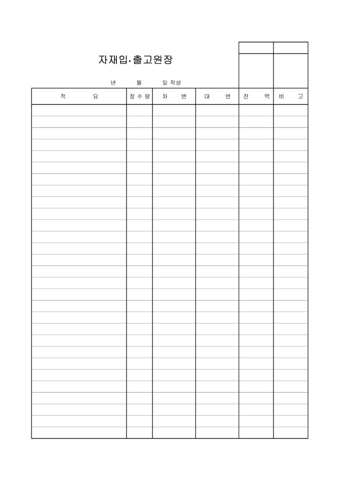 9,000원/월적요,정수량,차변,대변,잔액을 기록하는 자재입출고원장입니다.