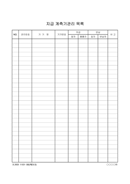 관리번호,기기명,기기번호,지급일자,불출자,반납일자,반납자를 기록하는 지급 계측기관리 목록표입니다.
