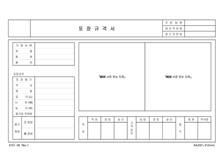 제품의 포장 규격을 나타내는 양식입니다. 포장용기, 색상, 재질, 길이 너비, 높이, 용기당 적재량등을 기재하고 BOX 사진 또는 도면을 부착하거나 삽입하도록 되어 있습니다.